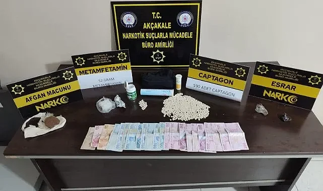 590 adet captagon hap, 2,20 gram esrar, 52 gram metamfetamin maddesi, 40 gram plaka esrar maddesi, Uyuşturucu madde ticaretinde kullanıldığı değerlendirilen 2965 ₺ para ele geçirilmiş,