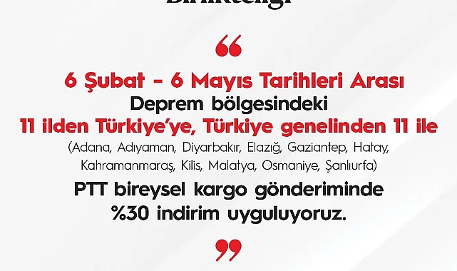 Ulaştırma ve Altyapı Bakanı Abdulkadir Uraloğlu, sosyal medya hesabından yaptığı paylaşımda, deprem bölgesinde depremin izlerini hep beraber sileceklerini ve bölgenin yeniden ayağa kaldırılacağını belirterek, bakanlığa bağlı PTT Genel Müdürlüğü eliyle deprem bölgesi için yeni bir kampanya başlattıklarını duyurdu. Uraloğlu, “Asrın felaketinde zarar gören illerimizin ticaret hayatının tekrar canlandırılması ve ülke ekonomisine kazandırılmasına katkı sağlamak için PTT Genel Müdürlüğümüz eliyle yeni bir kampanya başlatıyoruz. Deprem bölgesine yapılan her gönderi bir umut anlayışı ile 6 Şubat-6 Mayıs tarihleri arasında Adana, Adıyaman, Diyarbakır, Elazığ, Gaziantep, Hatay, Kahramanmaraş, Kilis, Malatya, Osmaniye, Şanlıurfa illerimiz çıkışlı ve varışlı gönderilere güncel tarife üzerinden yüzde 30 oranında indirim uyguluyoruz” ifadelerine yer verdi.
