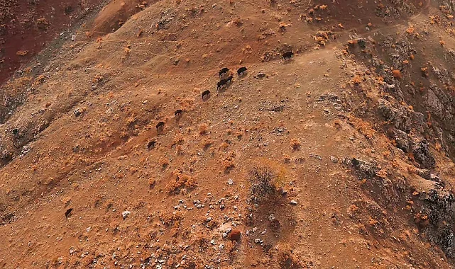 Elazığ'da dağlık alanda yaşamını sürdüren yaban domuzu sürüsü havadan görüntülendi.