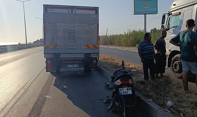 Antalya'da motosiklet sürücüsü emniyet şeridinde duran kamyonu son anda fark edince frene basarak durmaya çalıştı, ancak motosikletin kayması sonucu kamyona arkadan çarptı. Kazada motosiklet sürücüsü yaralandı.