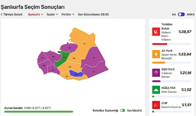 1 milyon 251 bin 37 seçmenin oy kullandığı Şanlıurfa’da, 2019 yılında yüzde 60,81 oy oranıyla ile göreve gelen Büyükşehir Belediye Başkanı Zeynel Abidin Beyazgül 31 Mart 2024 seçimlerinde yüzde 33, 64 oy alarak seçimi kaybetti. Yeniden Refah Partisi’nden Şanlıurfa Büyükşehir Belediye Başkanı Mehmet Kasım Gülpınar, yüzde 38,87 oy alarak kesin olmayan sonuçlara göre Büyükşehir Belediye Başkanı seçildi. DEM Parti adayı Celaledin Erkmen ise 21,16 oy aldı.